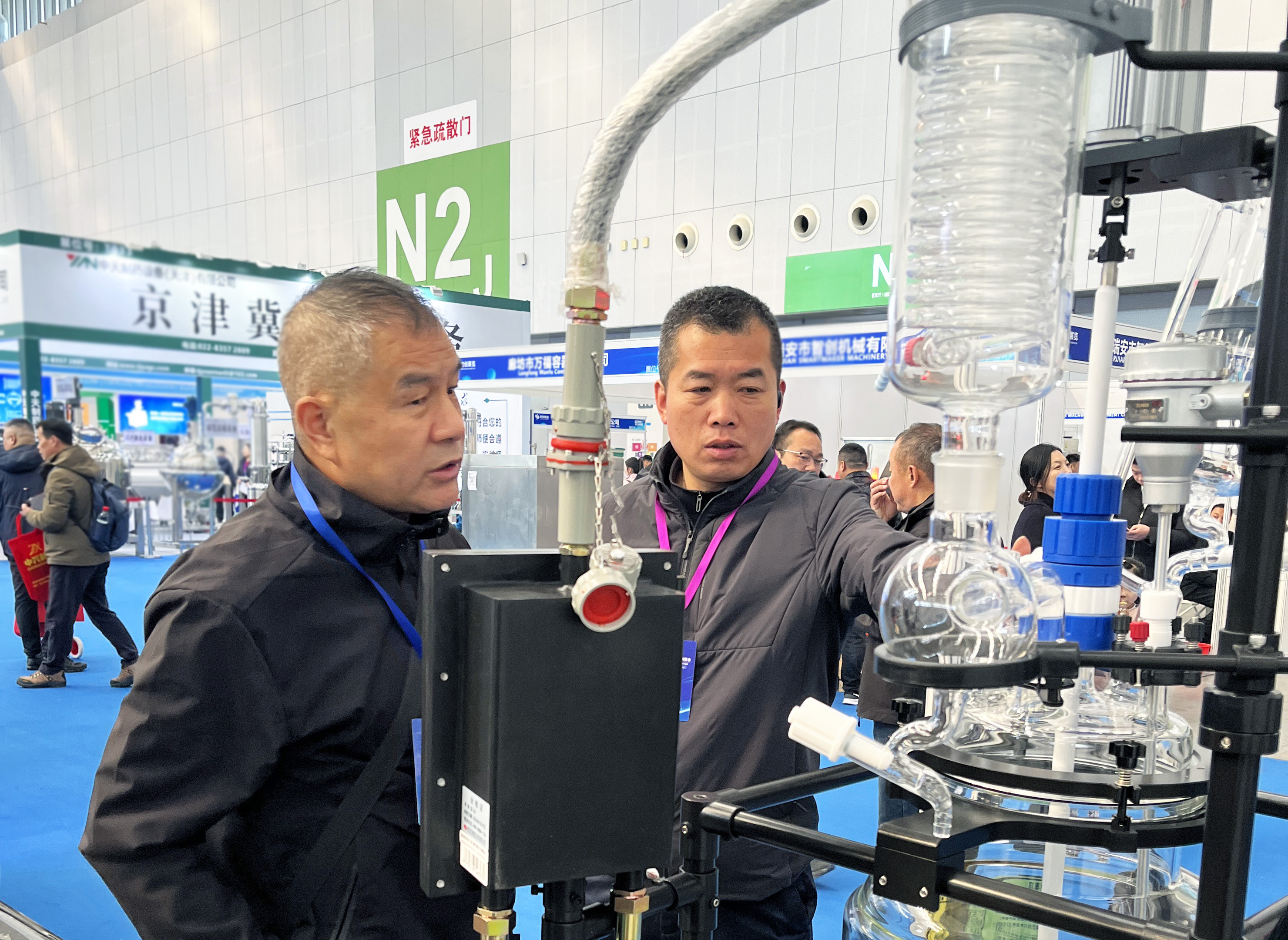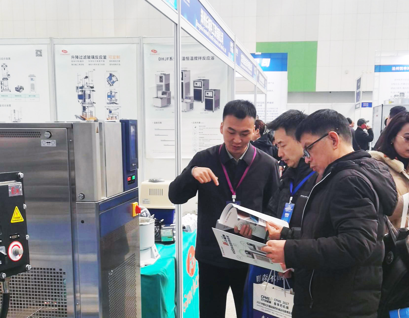 開展首日,長城科工貿展位便吸引了大量制藥企業、科研院所及行業專家駐足交流。從調速玻璃反應釜到旋轉蒸發儀,從防爆密閉制冷加熱循環裝置到動態流體溫度控制系統,每一款展品前都圍滿了前來咨詢、洽談的專業觀眾。